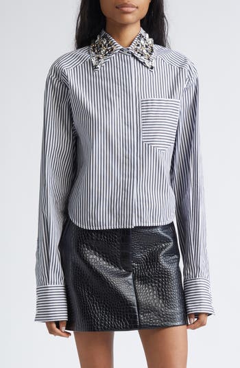 A glittering assortment of chunky jewels adorns the collar of this crisp cotton shirt cut with deep cuffs and mixed-direction stripes at the pocket.