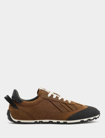 This Quarry sneaker in brown nubuck features a sleek silhouette and a lightweight grooved sole in TPU. A tone-on-tone interpretation of the Bally Ribbon embellishes the side, with a debossed Bally logo in one stripe for an iconic finish.