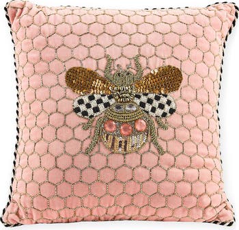 Glass beads and shiny embroidery draw attention to the queen bee sitting proudly atop this cotton accent pillow.