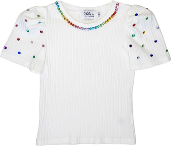 Elegant and Fun: Ribbed white tee embellished with vibrant rainbow gems along the neckline and sleeves for a sparkling touch. Stylish Sleeves: Features puff sleeves for a chic and trendy silhouette. Soft and Comfortable: Made from a high-quality, breathable fabric perfect for any occasion.