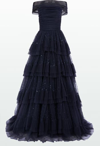 Designed with an off-the-shoulder neckline and a structured bodice, this gown features layered sheer tiers that add volume and soft movement. Delicate sparkle is scattered across the skirt, giving it a refined yet eye-catching finish. The floor-length silhouette and pleated detailing enhance its dramatic, romantic appeal. An elegant option for formal galas, evening balls or red carpet events.