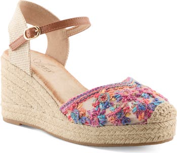 Flowery chenille embellishments bring eye-catching color to a warm-weather sandal lofted by an earthy espadrille-style platform wedge.