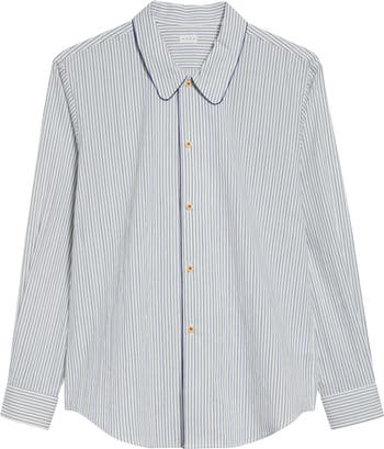 Extrafine piping mirrors the pinstripes on this relaxed cotton button-up shirt crafted in Japan with rounded collar points and pops of red stitching on the ivory buttons. Based on the spring '26 theme of 'Handmade by an Artisan,' this shirt finds value in the subtle touches rather than bold details.