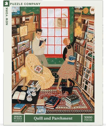 Get Lost in Literary Charm with the Quill And Parchment 1000 Piece Jigsaw Puzzle\r\n\r\nStep into the enchanting world of a cozy bookstore with the Quill And Parchment 1000 Piece Jigsaw Puzzle by renowned artist Lore Pemberton. This captivating scene brings to life a charming bookshop, where a man and woman browse the shelves, captivated by the endless treasures of literature. Outside, snow swirls on a cold winter’s day, contrasting beautifully with the bookstore’s warm and inviting glow.\r\n\r\nEvery detail of this puzzle is brimming with charm, from the colorful bookshelves filled with countless titles to the intricate patterns and cozy ambiance that define this wintery haven. The repeating book motifs and the vibrant colors of the scene provide a delightful challenge, perfect for puzzle enthusiasts looking for an engaging experience. Whether you’re working alone or with friends, this puzzle offers hours of enjoyment as you piece together the inviting world of Quill And Parchment.\r\n\r\nCrafted with care in the USA, each piece of the puzzle is uniquely die-cut, ensuring that no two pieces are alike. This random die-cut design makes for a one-of-a-kind assembly experience that reflects the exceptional craftsmanship of the puzzle. Made from premium materials, the puzzle delivers vivid artwork and a precise fit, ensuring durability and a high-quality finish.\r\n\r\nPerfect for book lovers, winter enthusiasts, and puzzle fans alike, the Quill And Parchment Jigsaw Puzzle provides a heartwarming escape into a world of books and wintery wonder. Order now and bring the magic of this cozy bookstore to life, one piece at a time!