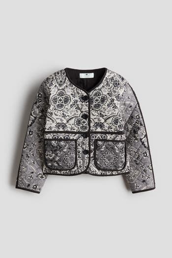 Lightly padded jacket in a quilted, patterned cotton weave with binding along the edges. V-shaped neckline, buttons down the front, dropped shoulders and patch front pockets. Lined.