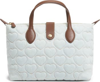 Whether slung from the long crossbody strap or carried in hand, this bag stashes your must-grab essentials within its petite proportions shaped from heart-quilted denim.