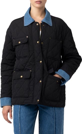 Puffed diamond-shaped quilting enhances the warmth of this chilly-day barn jacket updated with denim accents.