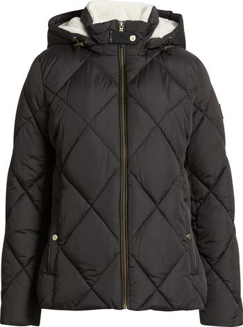 Faux leather accents add signature style to a diamond-quilted coat cozied up with a faux shearling lining at the collar and hood.