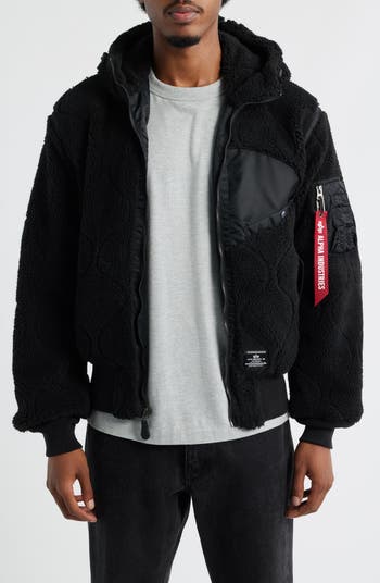 Take off and stay cozy at any altitude in this zip-up hooded jacket made from fuzzy fleece in an onion-quilted design with glossy satin insets.