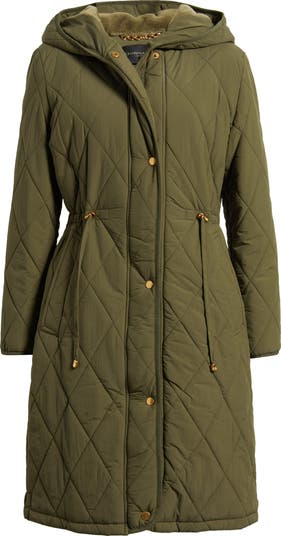 Faux fur lines the hood of a cozy coat offered in diamond quilting and shaped with a toggle-tightened waist.