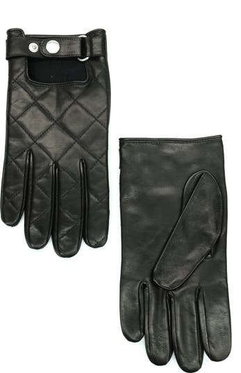 Men's leather gloves in quilted diamon shaped stitch design, opening on top and belt.