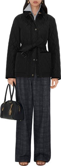A quilted jacket made from lightweight nylon with a contrasting lining in Burberry Check cotton twill. Cut to a regular fit, the style features tonal corduroy trims and a belt to cinch the waist.||Zip and press-stud closure|B buckle belt|Side patch pockets|Burberry Check lining|Equestrian Knight Design tag at side|Comes with a garment bag