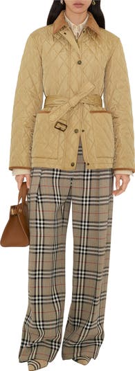 A quilted jacket made from lightweight nylon with a contrasting lining in Burberry Check cotton twill. Cut to a regular fit, the style features tonal corduroy trims and a belt to cinch the waist.||Zip and press-stud closure|B buckle belt|Side patch pockets|Burberry Check lining|Equestrian Knight Design tag at side|Comes with a garment bag