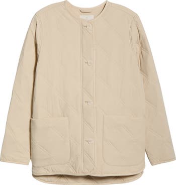 Puffy quilting distinguishes this button-up jacket that's cut from lightweight fabric, popped with handy pockets and easy to layer on cooler days.
