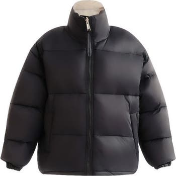 Built for cold-weather comfort, this black puffer jacket features a sleek quilted shell and a high collar lined for extra warmth. The horizontal stitching adds structure and insulation, while the minimalist design keeps it versatile for everyday wear. Elasticized cuffs and zip-front closure seal in heat and block out chilly winds. Light-colored fleece lining at the collar adds a soft touch where it matters most.