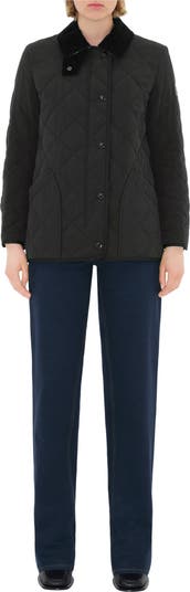 A quilted barn jacket in nylon with a corduroy collar, designed with 37.5® thermoregulation technology for insulation and breathability. The lightweight style is cut to a regular fit and lined in Burberry Check. ||Zip and press-stud closure|Throat latch|Side press-stud patch pockets|Press-stud cuffs|Leather patch with embossed Burberry lettering at sleeve|Burberry Check lining