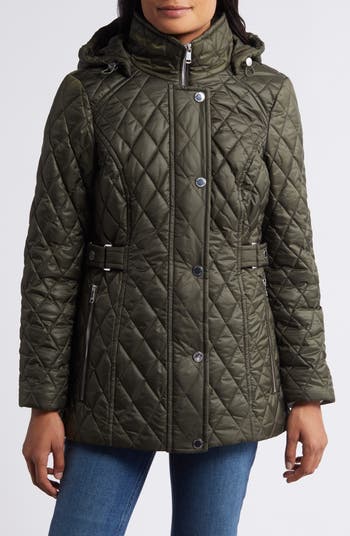 Cinching waist straps shape a quilted jacket that's ready for the elements with a water-resistant finish and removable hood.