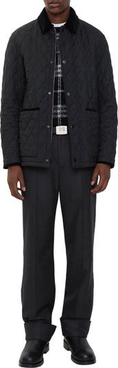 A quilted barn jacket made from lightweight wool flannel, lined with Burberry Check cotton twill in a seasonal truffle brown colourway. The style is cut to a regular fit with a corduroy collar and trims.||Two-way zip and press-stud closure|Side patch pockets|Burberry Check lining and undercollar|Equestrian Knight Design tab at side|Comes with a garment bag