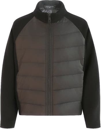 This sleek two-tone jacket blends warmth and mobility with a quilted front panel and smooth sleeves. The stand-up collar and designer finish make it a refined choice for layering through chilly days. Quilted insulation at the core offers lightweight warmth without bulk. Smooth side panels and sleeves provide flexibility and a tailored silhouette.