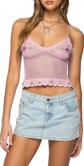Floral embroidery highlights the scalloped hem of an open-stitch crop top that completes your look with unmistakable retro-chic attitude.