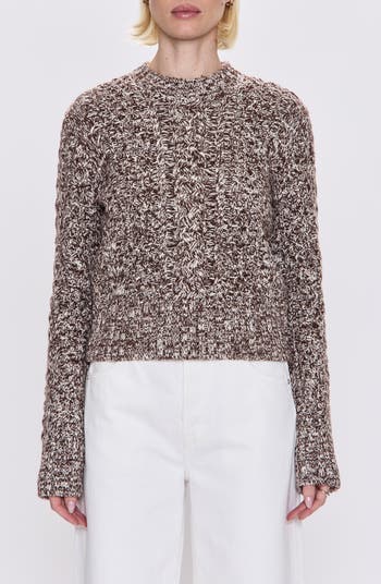 A mix of chunky stitches adds extra charm to a wool-kissed, cotton-blend sweater rendered in a snowy shade.