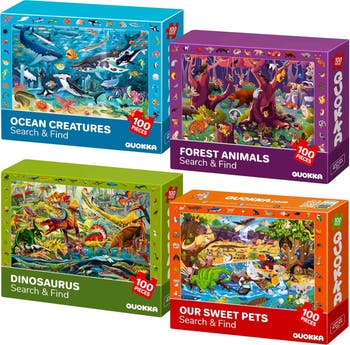 - Includes 100 and 150-piece puzzles with search-and-find elements