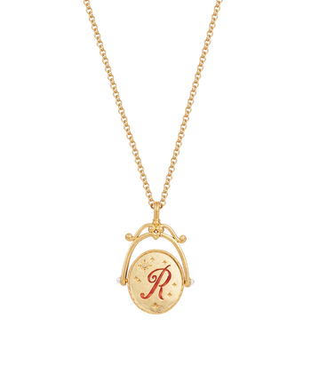 Our vintage style gold spinner initial necklace makes a wonderful gift or treat yourself as an act of self-love. Set in 22ct worn gold brass, on one side you'll find your 'R' initial engraved in a beautiful scroll font, on the other side, a hand-painted rose. Representing love and romance, it will take centre stage in any jewellery collection.