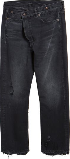 A signature asymmetrical front furthers the ripped-and-repaired vibe of these frayed-hem ankle jeans in a slouchy, grunge-era cut.