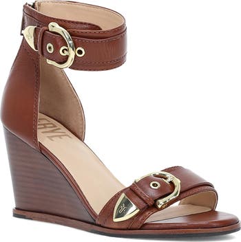 Buckled straps create an edgy aesthetic on a full-grain leather sandal lofted by a stacked wedge heel and set on a slip-resistant rubber sole.