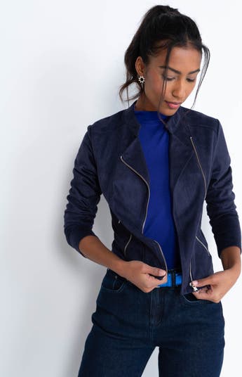 A bestselling style! A cropped biker style jacket in soft faux suede, featuring asymmetric full metal zip front fastening and zip pockets Unlined and complete with a short collar stand neckline.