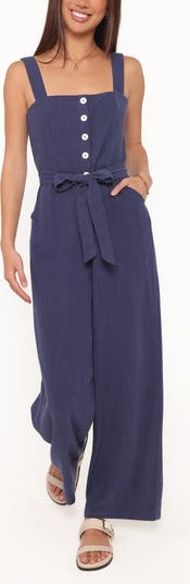 Elevate your contemporary wardrobe with this button-front jumpsuit featuring gently flared legs and adjustable tie belt at the waist.