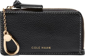 Glinting hardware and contrast stitching highlight the richly pebbled leather of a compact card case featuring a handy clasp to affix to your keys or favorite bag.