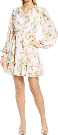 Delightful blooms enliven this breezy dress cut from Swiss-dot chiffon and detailed with fanciful frills.