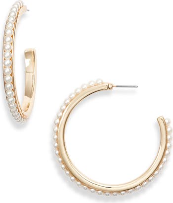 Striking a lovely note of modern femininity, slender hoops are adorned by a row of imitation pearls. These pretty earrings are part of an exclusive collection by blogger and style influencer Rachel Parcell, celebrating romance and femininity for every moment.