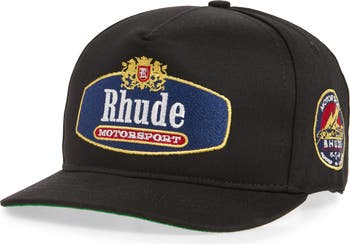 Lead the pack in this heavyweight twill cap branded with custom embroidery inspired by classic motorsports iconography. Custom Rhude hardware glints from the adjustable back strap.