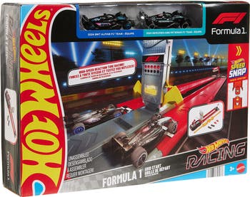 Includes: 1 Hot Wheels Racing Formula 1 Grid Start Track Set, 2 Hot Wheels Formula 1 die-cast cars in 1:64 scale and 2 Speed Snap Track System adapters.