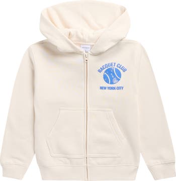A zip-front hoodie sweatshirt with a sporty front graphic is made from a fleecy-soft cotton blend to keep your little guy comfy and cozy.