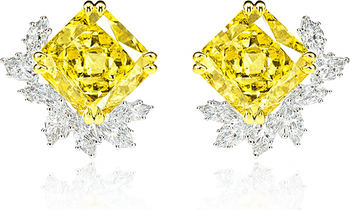 Light up every room with these striking canary yellow diamond earrings. Featuring bold, square-cut yellow diamonds at the center, each stone is secured in elegant gold prongs and framed by a delicate spray of brilliant white diamonds. The contrast of vibrant yellow against the icy sparkle creates a breathtaking harmony of color and fire. Perfect for adding a burst of glamour to evening attire or making a confident daytime statement, these earrings embody rare beauty and timeless sophistication.