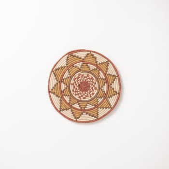 Add another useful statement piece to your table top - Use this handcrafted trivet to protect your furniture and display your home cooked goodness. Handwoven in the rich color palette of the Elevate Collection, the 2025 annual small batch basket collection. Handcrafted by women artisans from the Batoro living in the very rural mountains of Western Uganda. These weavers are a part of a cooperative that provides training to single mothers, widows and other marginalized women who are subsistence farmers and weave baskets to provide additional income. Made from all natural, sustainably sourced raffia and banana fibers. Unique, bold mix of natural and AZO free dyes - Natural dyes are made from various plant materials grown in artisan’s villages. The women grow, harvest and make all the natural dyes which take a great deal of knowledge and skill to produce.   The hand-dyed raffia is twisted and wrapped around coils of banana fibers, creating structure and intricate designs. No two baskets are identical - there will be slight variations in size and color from the one shown due to the handmade nature of each product. Each basket is both special and unique. HANDMADE IN UGANDA APPROXIMATE SIZE:  8" x . 25"