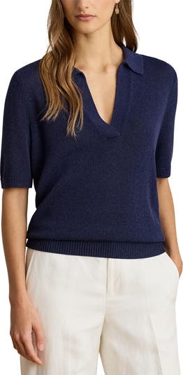 Extend sweater season with a short-sleeve option topped with a jaunty collar and knit from a cotton-enriched blend.
