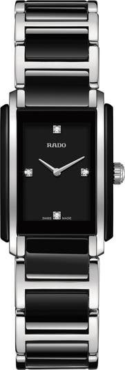 Four diamonds twinkle against the clean rectangular dial of a Swiss-made bracelet watch cast in a combination of high-tech ceramic and stainless steel for durability and lightweight comfort. Two-tone styling completes the elegant design.