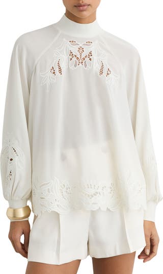 Light and lovely, this top features intricate broderie anglaise detailing and ribbing at the cuffs and neckline that perfectly balance the softly billowy silhouette.