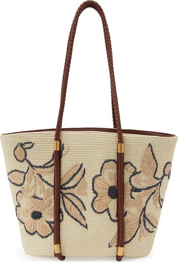 Raffia-like floral embroidery brings a beachy feel to this wicker-weave tote encircled by braided faux-leather shoulder straps and fitted with an interior zip pocket for small essentials.