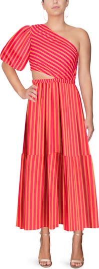 Make a bold statement in this vibrant one-shoulder maxi dress, designed with a flattering side cutout and flowy silhouette. Crafted from breathable cotton, it blends eye-catching style with effortless comfort—perfect for sunny getaways, summer events, or standout moments.