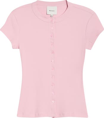 Fine allover ribbing and a kiss of stretch enhance the close fit of this front-button top framed by abbreviated sleeves.