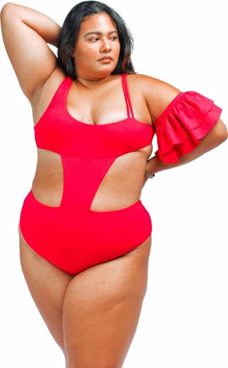 Red one piece bathing suit with one ruffle sleeve, adjustable shoulder straps, center panel that partially covers the tummy and high waisted bottom.