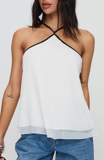 Contrasting trim adds an elevated feel to this airy chiffon halter-neck top cut in a flowy fit and detailed with adjustable straps for a perfect fit.
