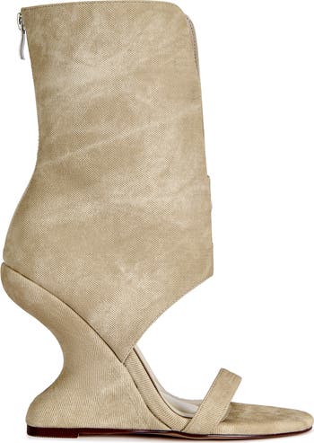 Like VINCENT, but the summer version. Wedge sandal bootie with a split canvas shaft and sculpted curved wedge-effortlessly chic, modern, and easy to wear.Heel height: 4.5"Shaft height: 8"Calf circumference: 17"