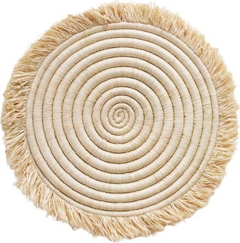 - PRODUCT FEATURES: - Handcrafted in Rwanda using traditional weaving techniques. - Made from locally sourced raffia palm trees. - Features a distinctive natural and black fringe detail. - Versatile for both indoor and outdoor dining. - Sold individually, allowing for flexible table setting arrangements. PRODUCT SPECIFICATIONS: - Diameter: 12" - Material: Raffia - Color: Black with natural and black fringe - Care: Spot clean; bright colors will fade in direct sunlight. - Country of Production: Rwanda CARE INSTRUCTIONS: Spot clean Bright colors will fade in direct sunlight