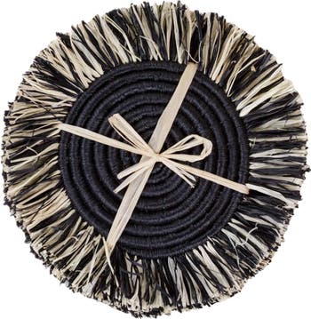 This set of 4 coasters is perfect for entertaining, gifting giving, or curating a unique table setting for indoor and outdoor dining. Our coasters are handcrafted in Rwanda with a time-honored weaving technique passed down from generations of artisans. 6”diameter Set of 4 coasters Black color with natural and black fringe Locally sourced raffia from palm trees The ideal housewarming gift, the Mixed Raffia Fringe Set of 4 Coasters adds a nice touch to any tabletop!